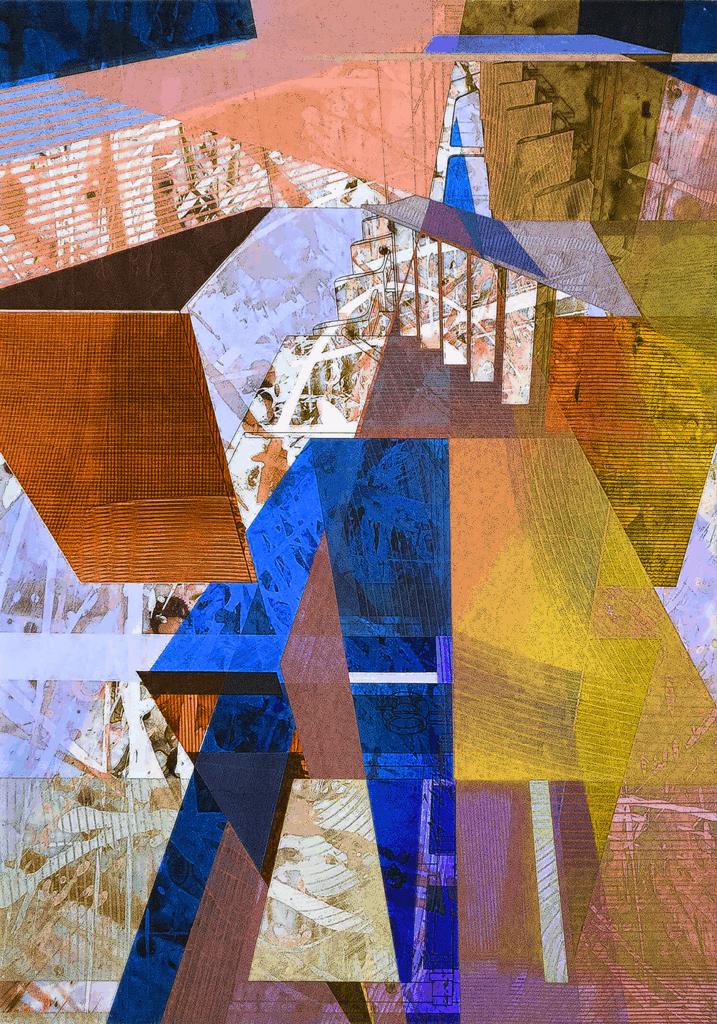 signal / an abstract composition built from layered, fractured forms and shifting tonal fields. within the dark density of the image, flashes of white and sudden accents of yellow ochre break through — leaving the viewer to question whether they function as beacons or as warnings / hand-painted digital brushwork on stainless steel, sealed beneath acrylic glass / 84×120cm (33×47in) also available in 120×170cm (47×67in)