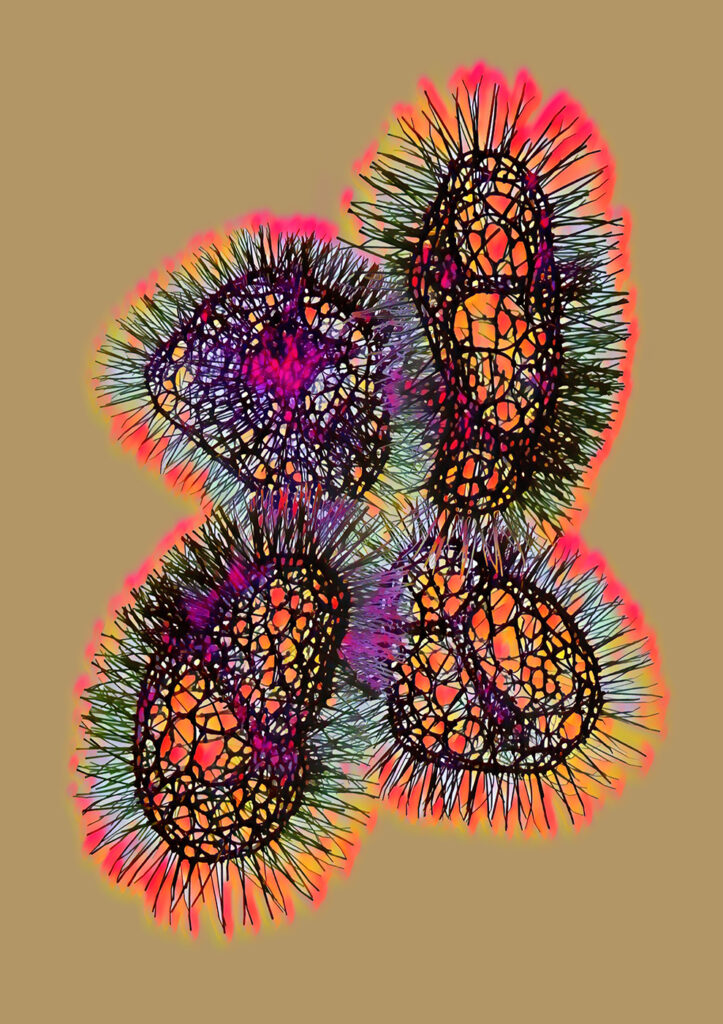 spiky things / digital drawing, hand coloured / printed on acrylic glass / 60 × 80 cm (24 × 32 in)
